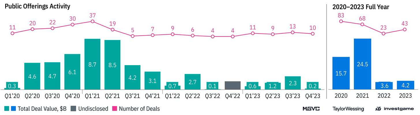 Signs of improvement appeared in 2023. There were 43 public offerings (almost double the previous year) totaling $4.2 billion (+16% compared to 2022).