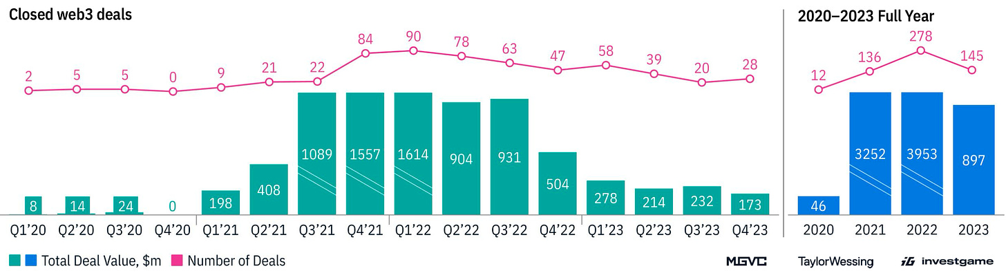 Nevertheless, InvestGame notes a positive trend. The market in 2023 is significantly higher than in 2020. Overall, the gaming Web3 market is becoming niche, with fewer developers, investors, and smaller checks.
