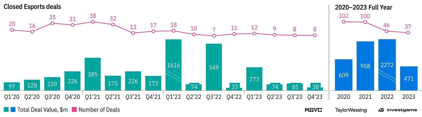 The number of investments in esports decreased by 20% in 2023 (37 deals). The investment volume dropped by 4.8 times to $471 million.