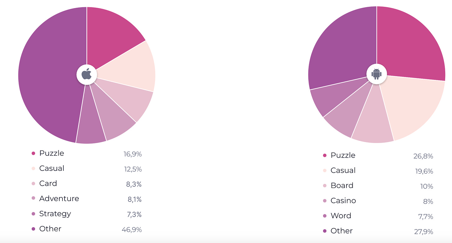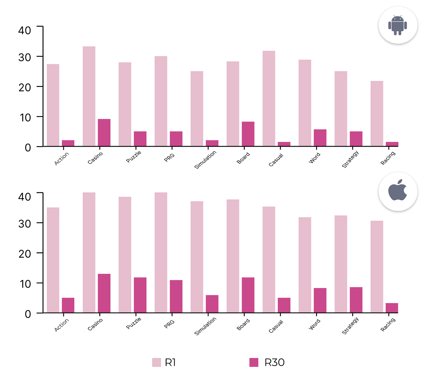 Casino games are leaders on iOS in R1 - 40.6%. This genre also leads in R30 on Android (9.1%) and iOS (13.6%). RPG games also show good figures in R1.