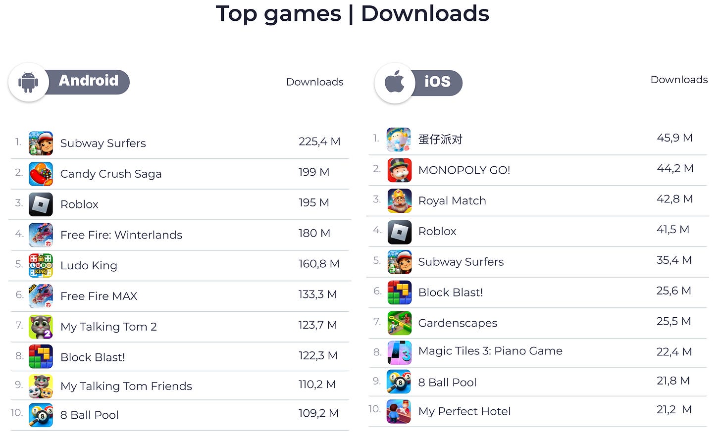 The situation is significantly different on iOS. Eggy Party (45.9 million downloads) is in first place, followed by MONOPOLY GO! (44.2 million), and Royal Match (42.8 million).