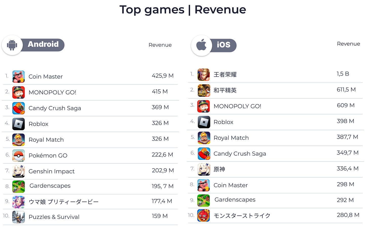 Coin Master ($425.9 million), MONOPOLY GO! ($415 million), and Candy Crush Saga ($369 million) - revenue leaders on Android.