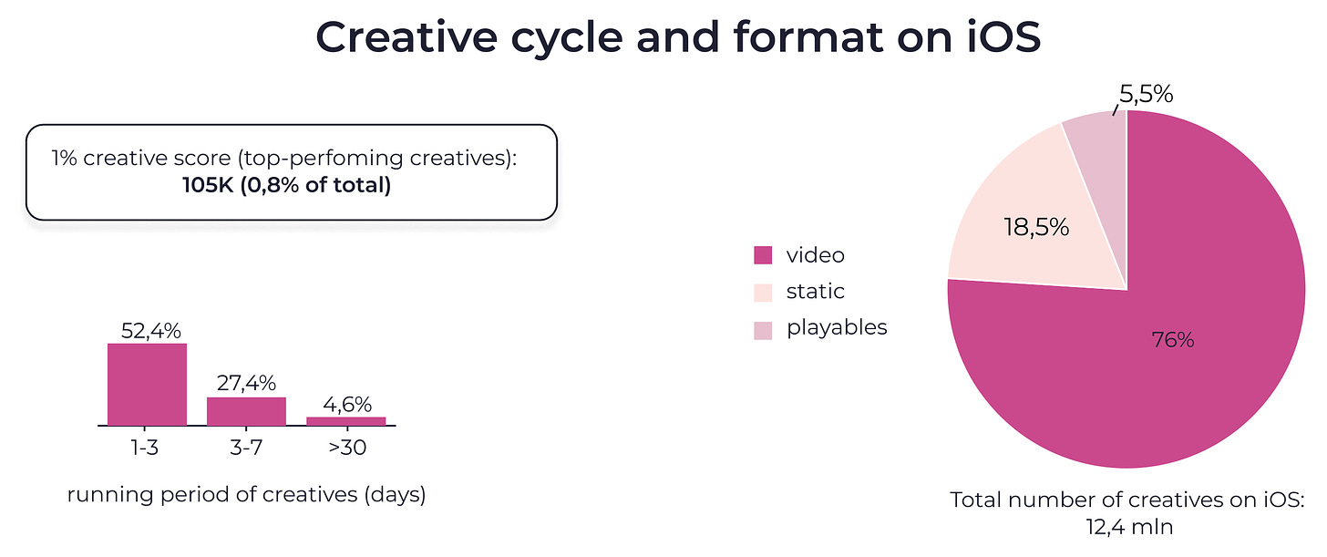 On iOS, only 4.6% of creatives last more than 30 days. The majority - 52.4% - last no more than 1-3 days.