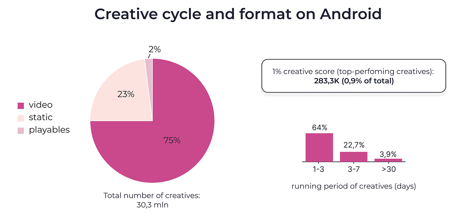 In the case of Android, 75% of all creatives are videos; 23% are static; 2% are playables.