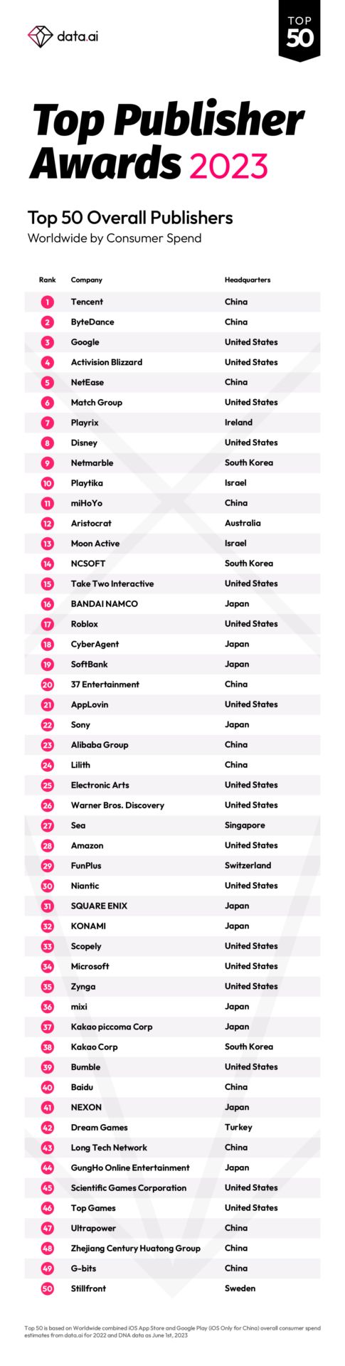• Besides 5 gaming companies, Tencent, ByteDance, and Disney are in the top 10. They do have both gaming and non-gaming apps.