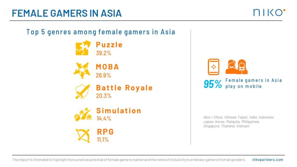 • Puzzle (39.2%); MOBA (26.9%); Battle Royale (20.3%); Simulation (14.4%); RPG (11.1%) are the most popular genres among female gamers in Asia.