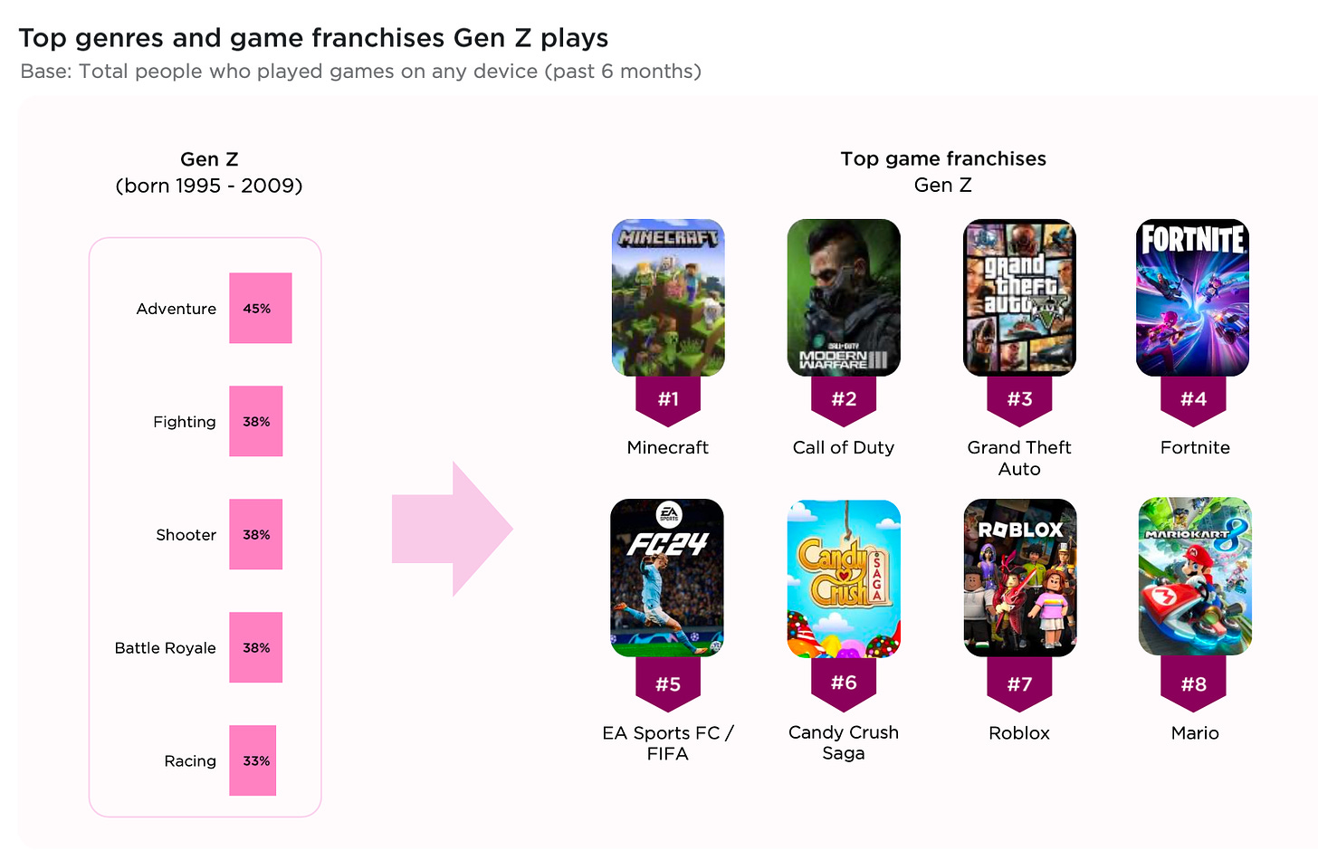 Minecraft, Call of Duty, and Grand Theft Auto are the most popular franchises among Generation Z users.