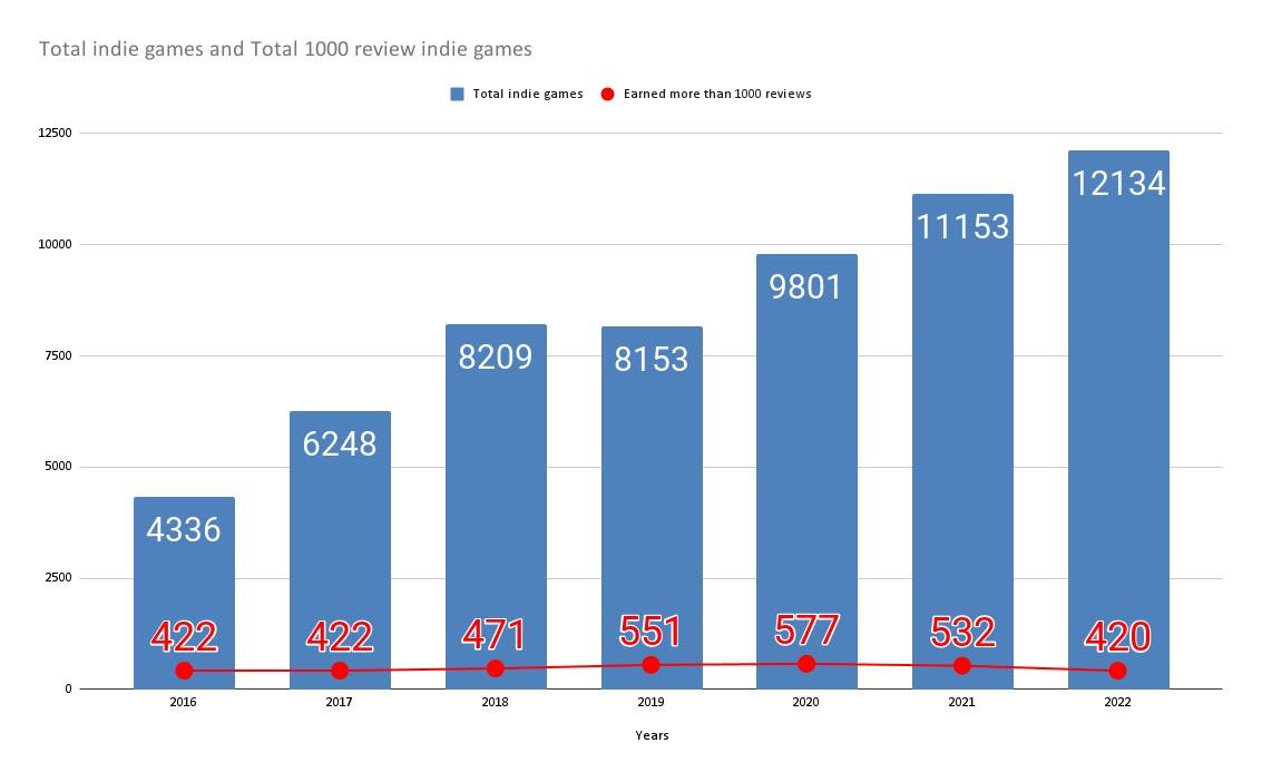 For the past 8 years, the number of games on Steam with more than 1000 reviews has remained roughly the same - about 500 games per year. This is bad news because competition increases as the number of released games grows.