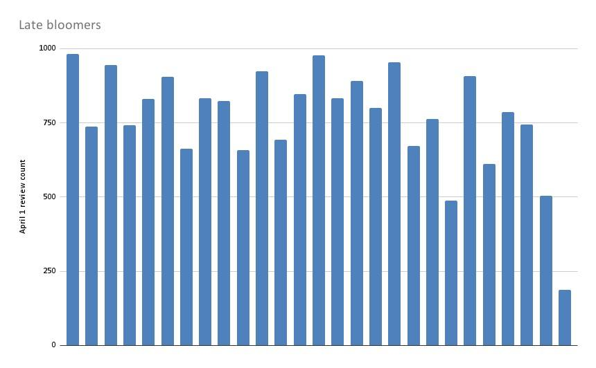 Chris also counted the number of “sleeper hits” - projects that did not receive 1000 reviews in the quarter of their release but did so in the following quarter. There were 28 such games in Q2 2024. Most of them were close to this mark in the release quarter.