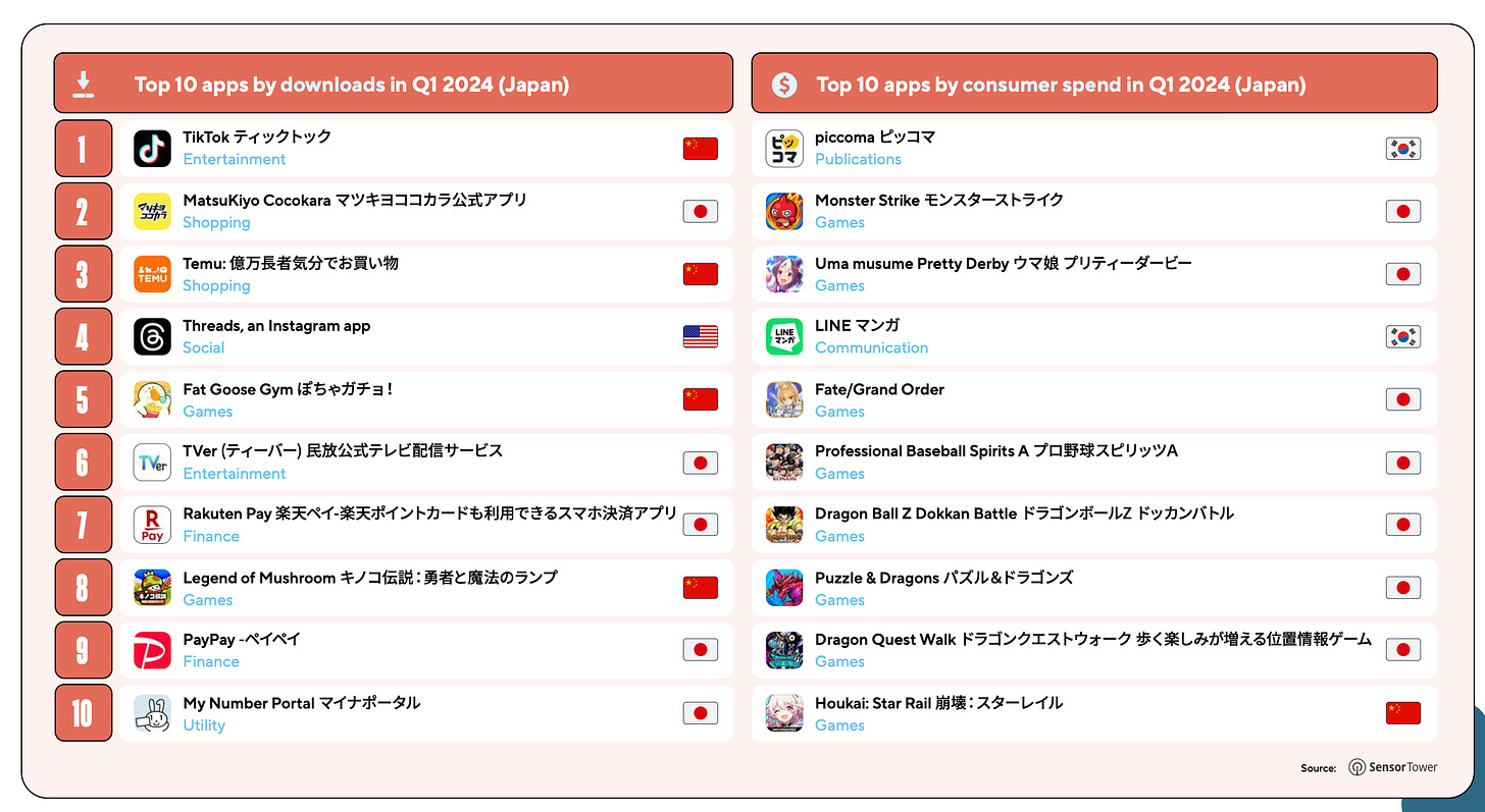- In Q1’24, 8 out of the top 10 apps by revenue were games. The only non-gaming apps in the top 10 were piccoma (a manga app - ranked 1st) and LINE (a messaging app - ranked 4th).