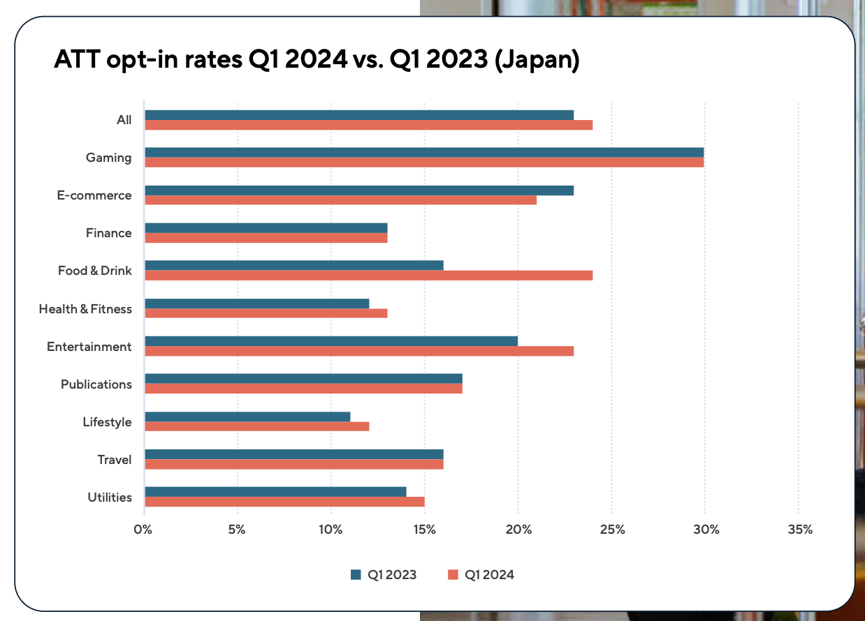 - ATT opt-in rates in Japan have been growing year by year. The highest rate in Q1’24 was for games at 30%, the same as the previous year.