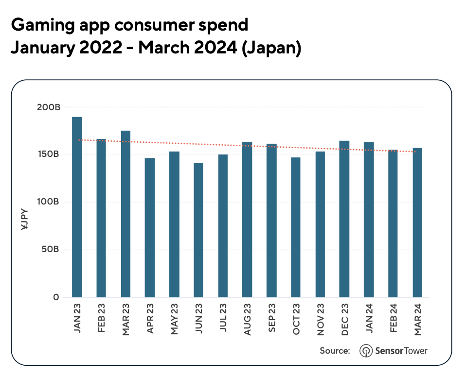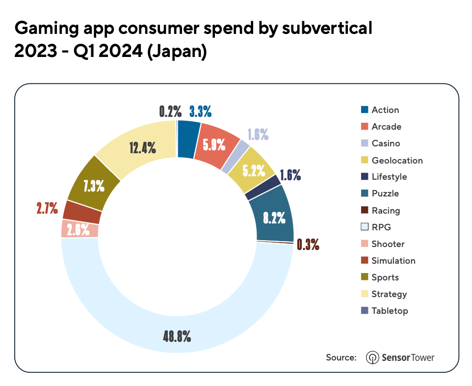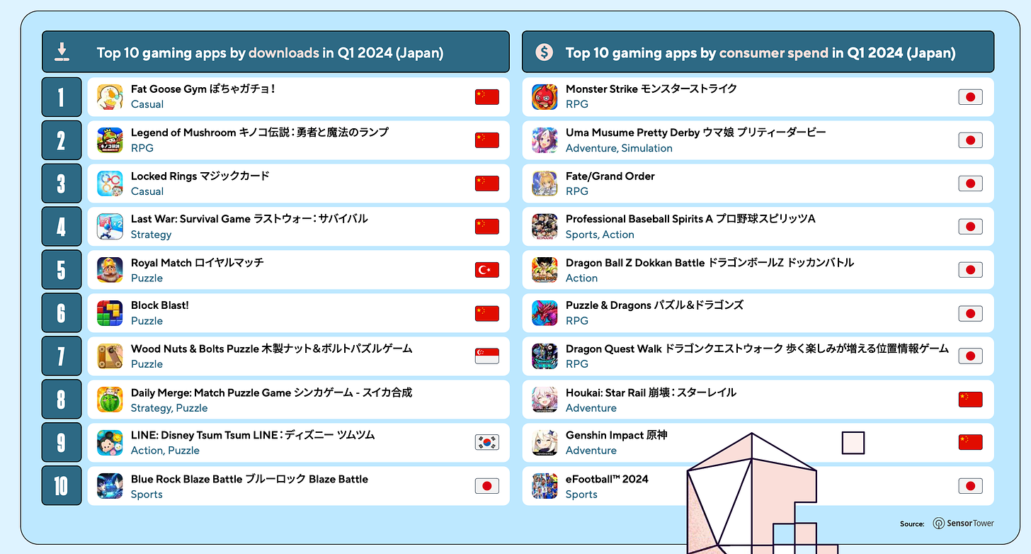 - Monster Strike, Uma Musume Pretty Derby, and Fate/Grand Order topped the revenue charts in Q1’24.