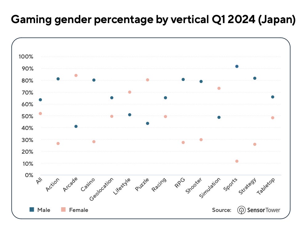 - The gaming audience in Japan is predominantly male (63.6%). In certain genres (e.g., sports games), the male audience reaches 91.8%, while in arcade games, the majority are female (58.9%).