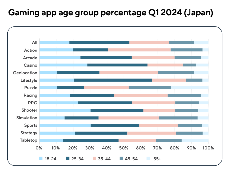 - The largest segment of Japanese mobile gamers (35.5%) is aged 25-34, making it the most active demographic.