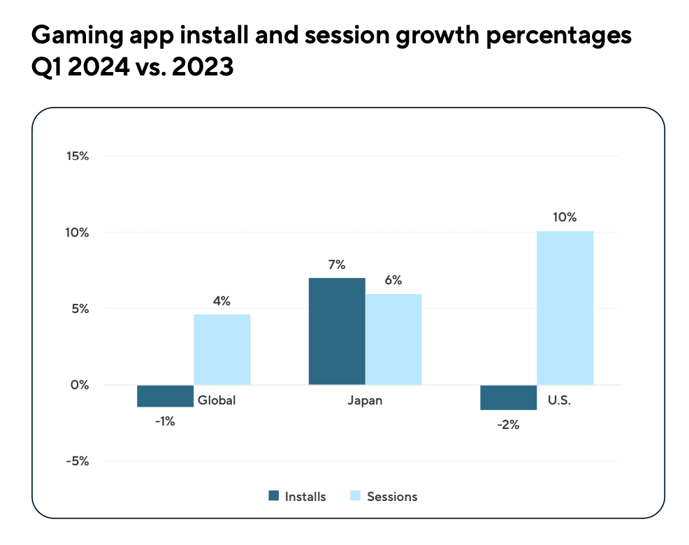 - Comparing Q1’24 to the average figures for 2023, downloads rose by 7% and sessions by 6%. Globally, downloads fell by 1% while sessions increased by 4%; in the US, downloads decreased by 2% while sessions grew by 10%.