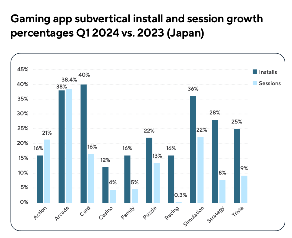 - The growth leaders in Q1’24 were arcade games (sessions up by 38.4%, downloads by 38%), card games (downloads up by 40%, sessions by 16%), and simulation games (downloads up by 36%, sessions by 22%), compared to the average values of 2023.