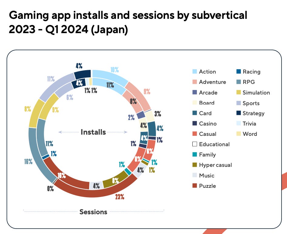 - Action games saw the highest revenue growth in Q1’24 with a 21.6% increase. Puzzle games also grew significantly by 13.8%.