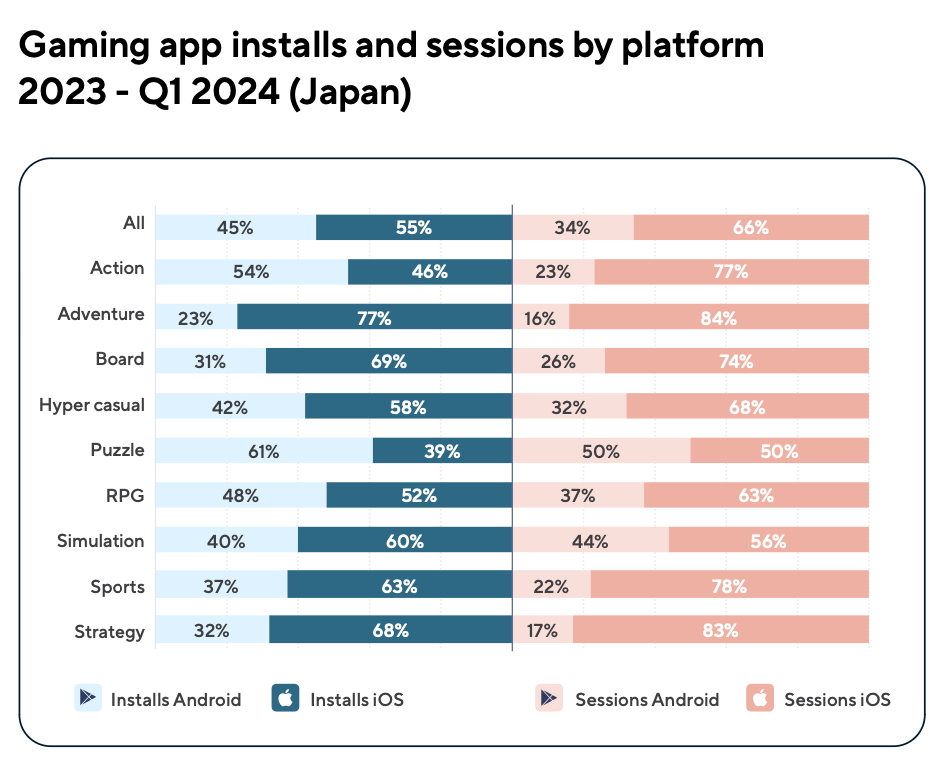 - Overall, game app downloads in Japan are balanced between devices, with 55% on iOS and 45% on Android. Some genres, such as adventure games, are dominated by iOS (77%).