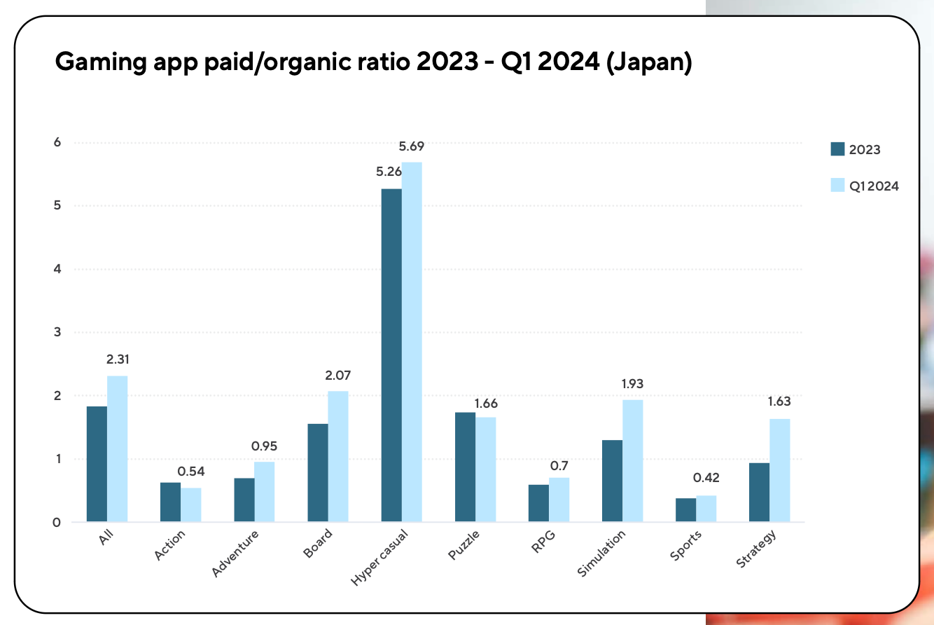 - The ratio of paid to organic traffic in Japan increased in Q1’24. The average for 2023 was 1.82, rising to 2.31 in Q1’24, indicating an increase in paid traffic. Spending grew the most on hyper-casual projects, board games, and the simulation genre.