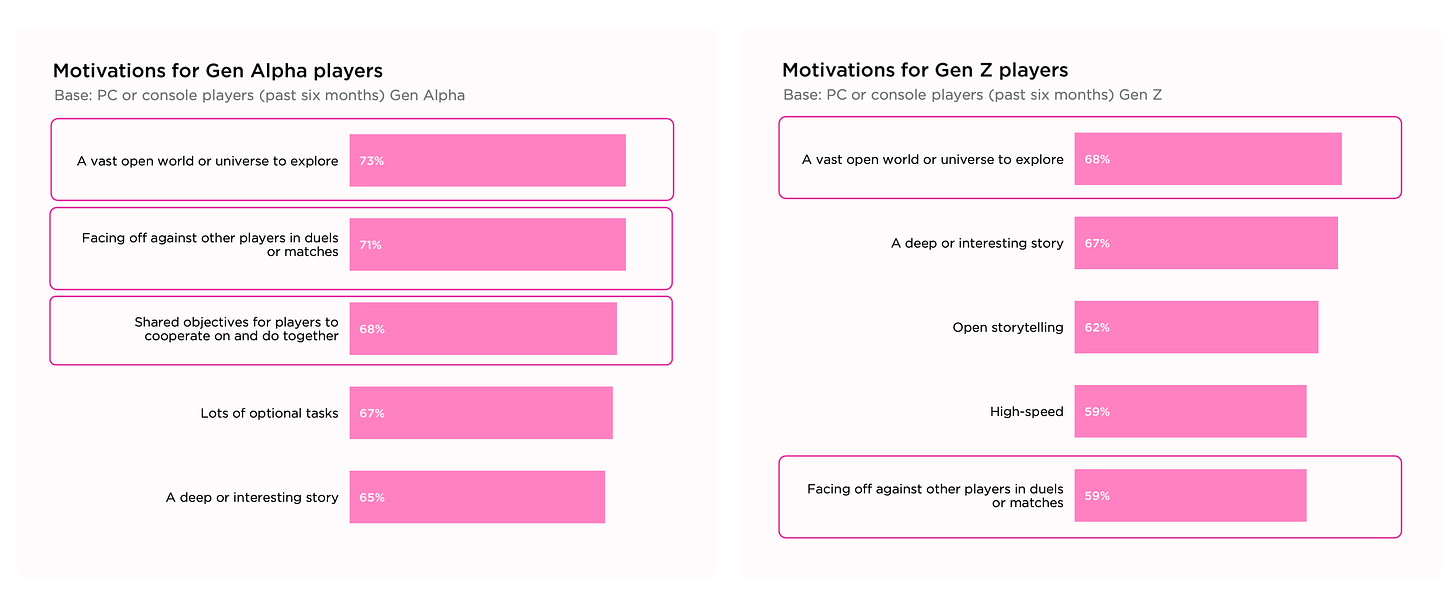 For PC and console players, a large open world (66%) and an interesting story (65%) are important.