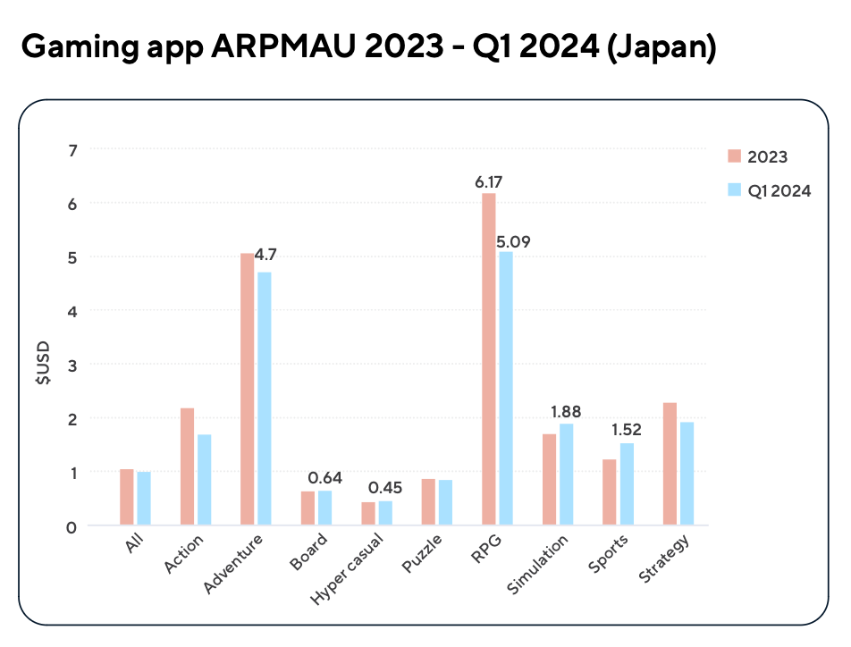 - ARPMAU (average revenue per monthly active user) fell from $1.04 in 2023 to $0.99 in Q1’24. RPGs had the highest ARPMAU - $6.17 in 2023 and $5.09 in Q1’24; adventure games followed with $5.06 in 2023 and $4.7 in Q1’24. Hyper-casual games had the lowest ARPMAU - $0.43 in 2023 and $0.45 in Q1’24.