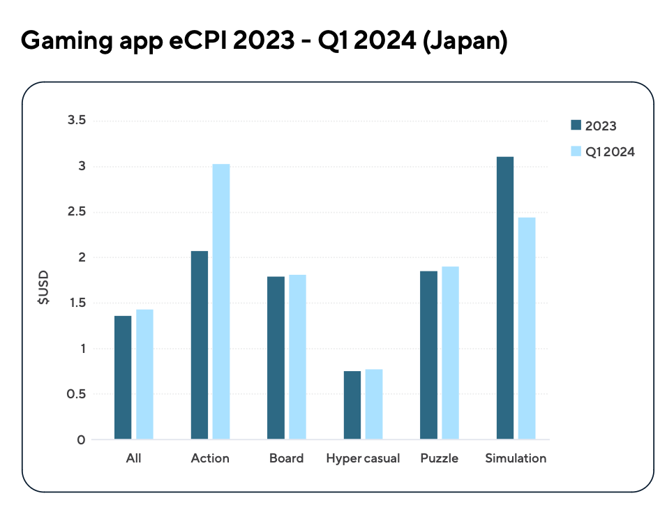 - eCPI (effective cost per install) in Japan increased from an average of $1.36 in 2023 to $1.43 in Q1’24. The most significant growth was in action games ($2.07 in 2023 vs. $3.03 in Q1’24). However, eCPI in simulation games decreased from $3.11 in 2023 to $2.44 in Q1’24.