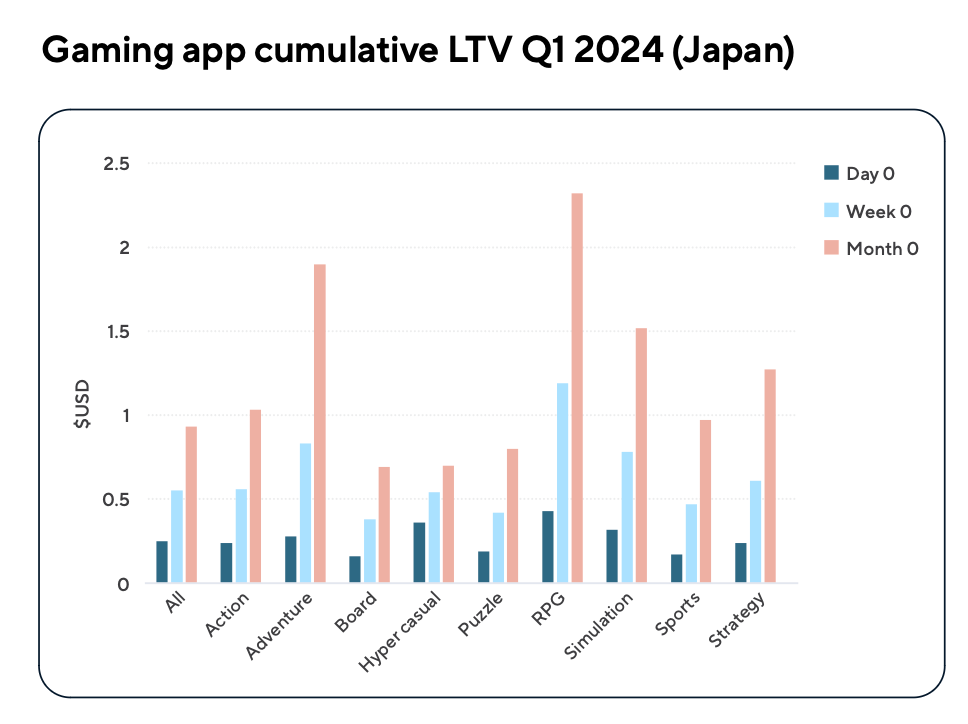 - The highest first-month cumulative LTV was for RPGs ($2.32) and adventure games ($1.9). The first-day LTV for hyper-casual games was comparable to that of RPGs in Japan.