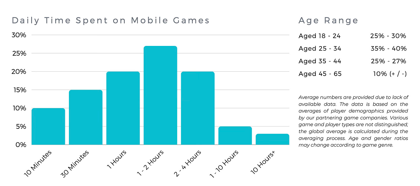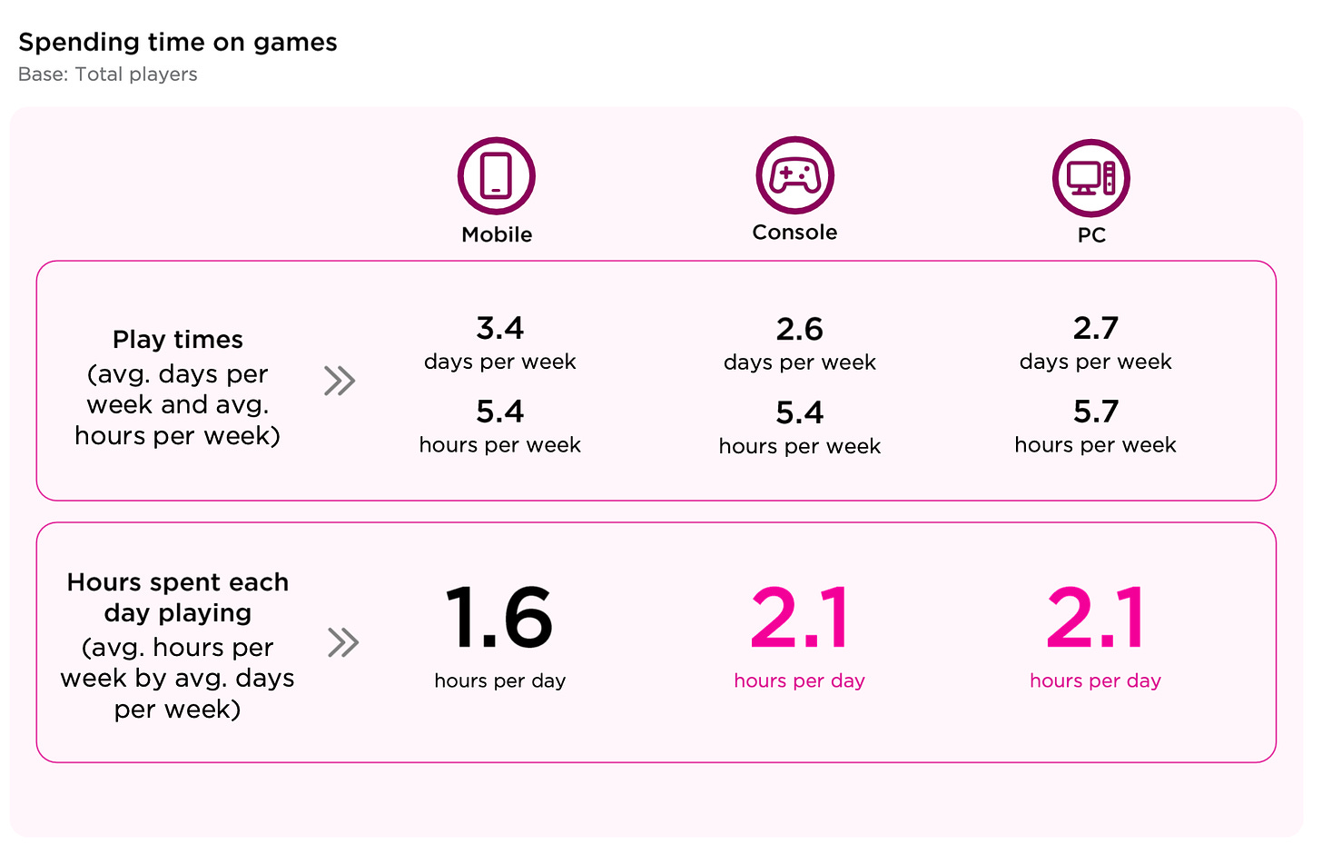 PC and console players play more per day on average — 2.1 hours, compared to mobile device players — 1.6 hours. However, on mobile devices, people play an average of 3.4 days a week, while on PC/consoles — 2.6-2.7 days a week. As a result, the total number of hours spent playing per week is almost equal.