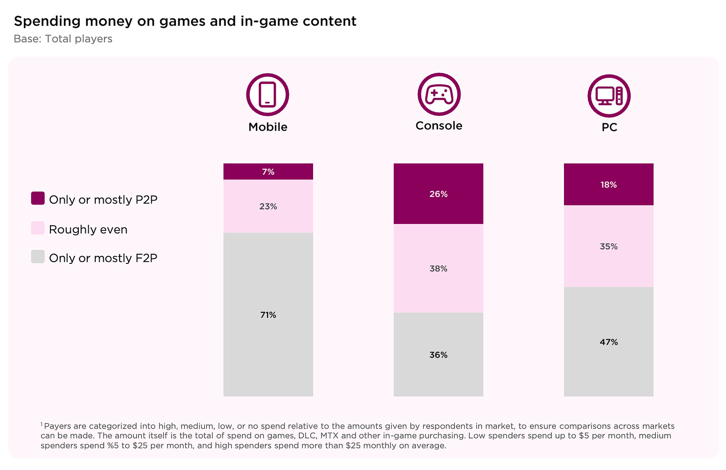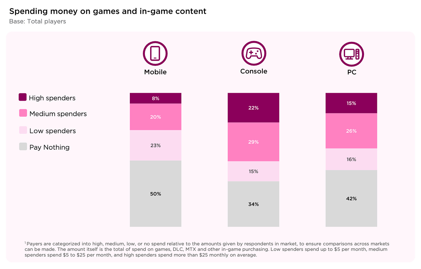 Newzoo shows that 47% of PC players; 71% of mobile device players, and 36% of console players mainly play free games. For example, only 26% of people are willing to pay for games on consoles, and only 7% on mobile devices.