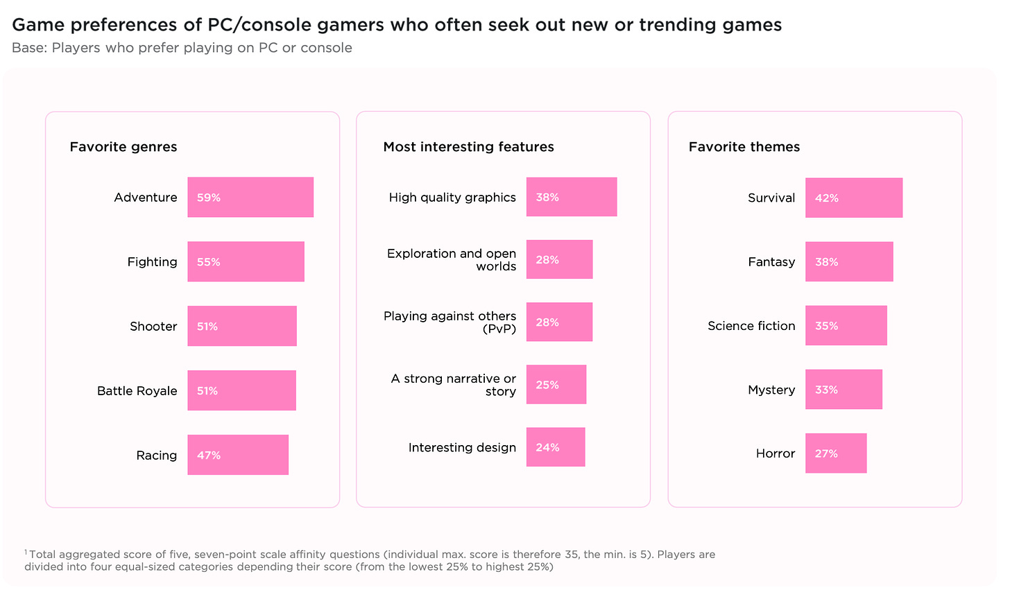 These users prefer adventure games (59%); good graphics are important to them (38%); and among gameplay aspects, survival elements are important (42%).