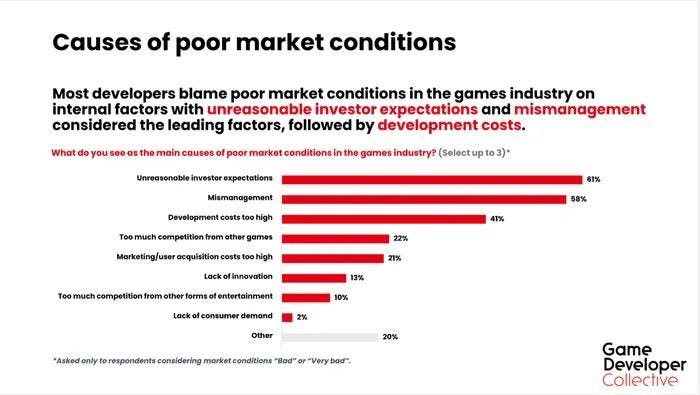 Developers also pointed out who they think is to blame for this situation. Among those dissatisfied with the state of the industry, 61% blamed unrealistic investor expectations. 58% cited poor management. Other reasons mentioned include increasing budgets (41%), competition from other games (22%), and the need for high marketing expenses (21%).