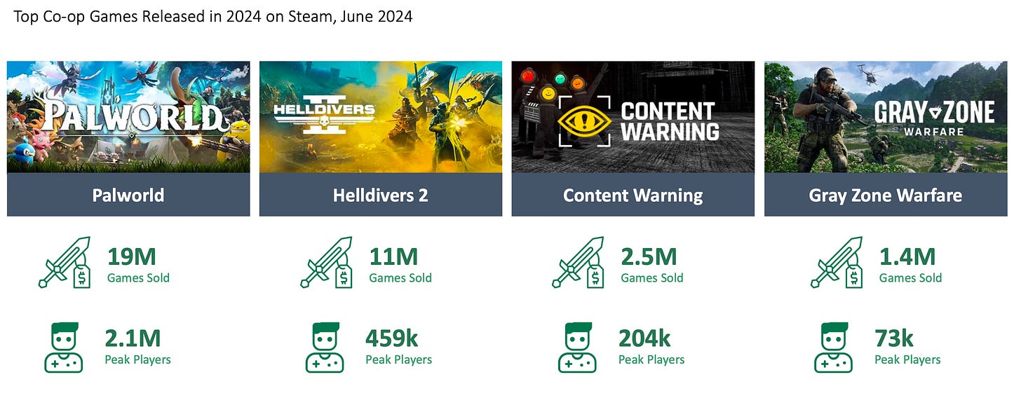 According to VGI, the largest cooperative games in 2024 are: Palworld (19 million copies; peak CCU - 2.1M); Helldivers II (11 million units; peak CCU - 459k); Content Warning (2.5 million copies; peak CCU - 204k); Gray Zone Warfare (1.4 million copies; peak CCU - 73k).