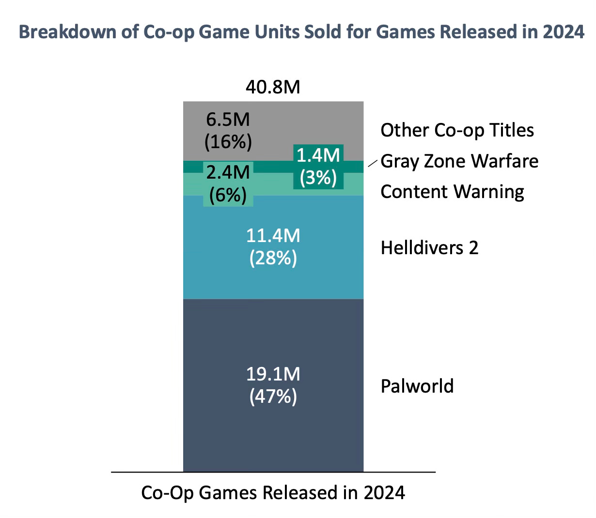 In 2024, more than 40 million copies of co-op games were sold. Palworld accounts for 47% of this volume; Helldivers II for 28%. The other projects make up 16%.