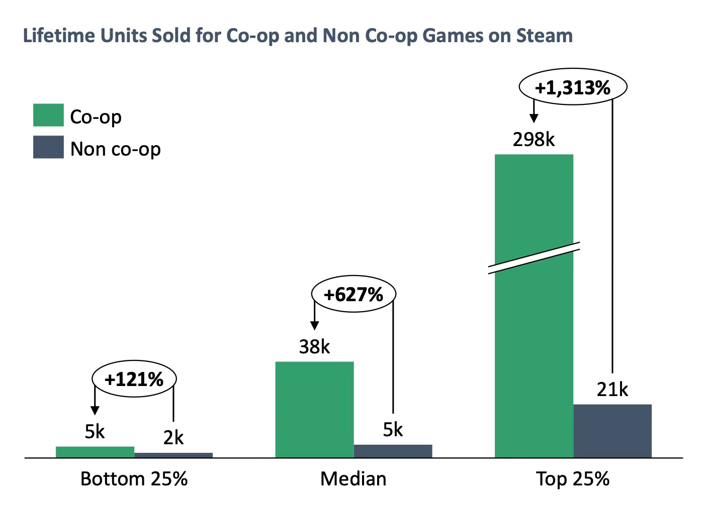 Cooperative games on Steam outperform single-player games in terms of sales. A typical cooperative game sells around 40,000 copies compared to 5,000 for a single-player game.