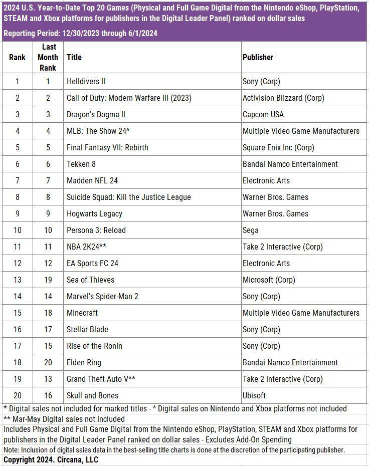 Only 2 games from the top 10 for the first half of the year were released in 2024 - Helldivers II (2nd place) and The Last of Us: Part II - Remastered (10th place).