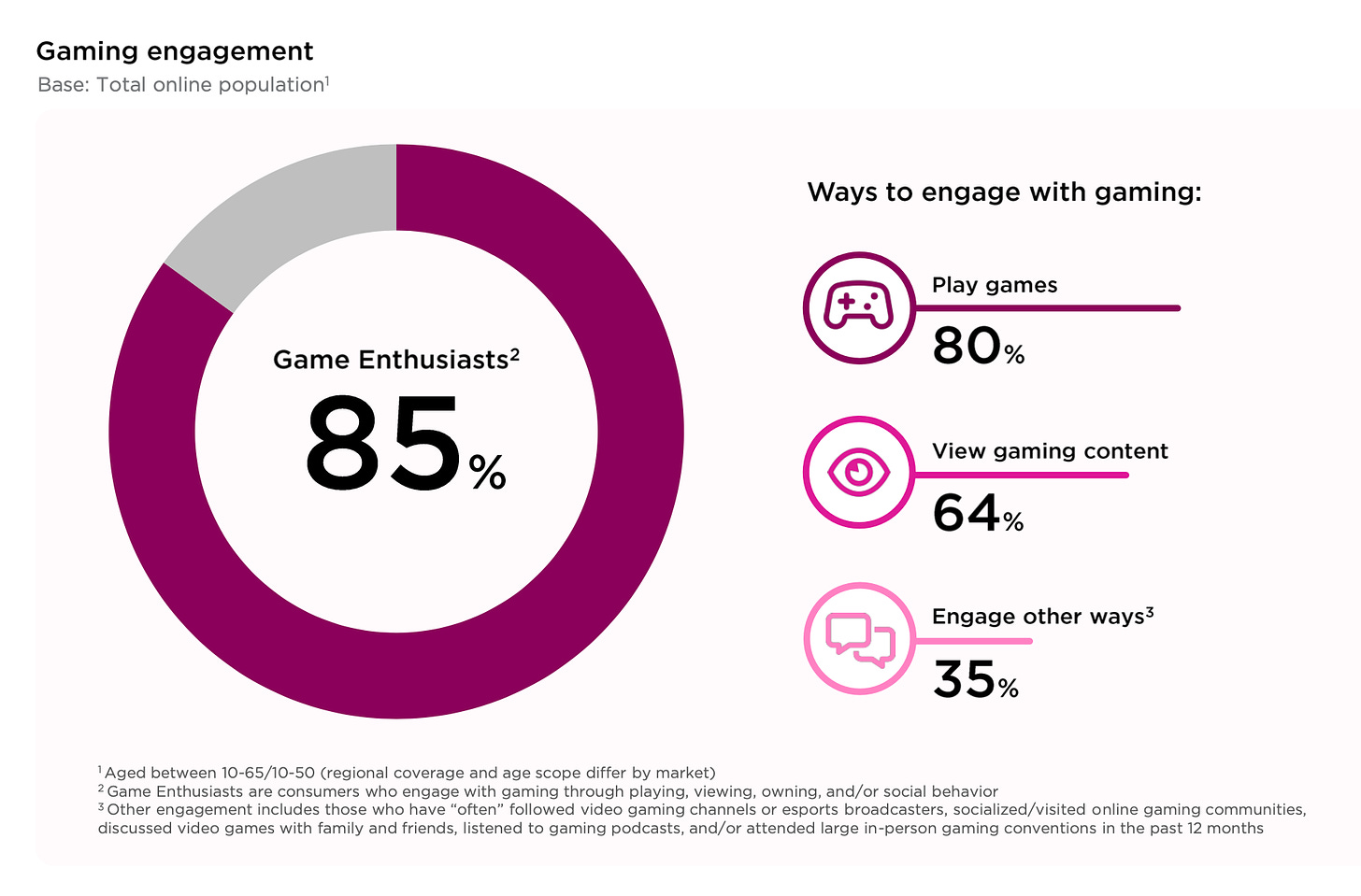 64% of people watch gaming content; 35% engage in other ways (discuss with friends, are part of the communities, etc.).
