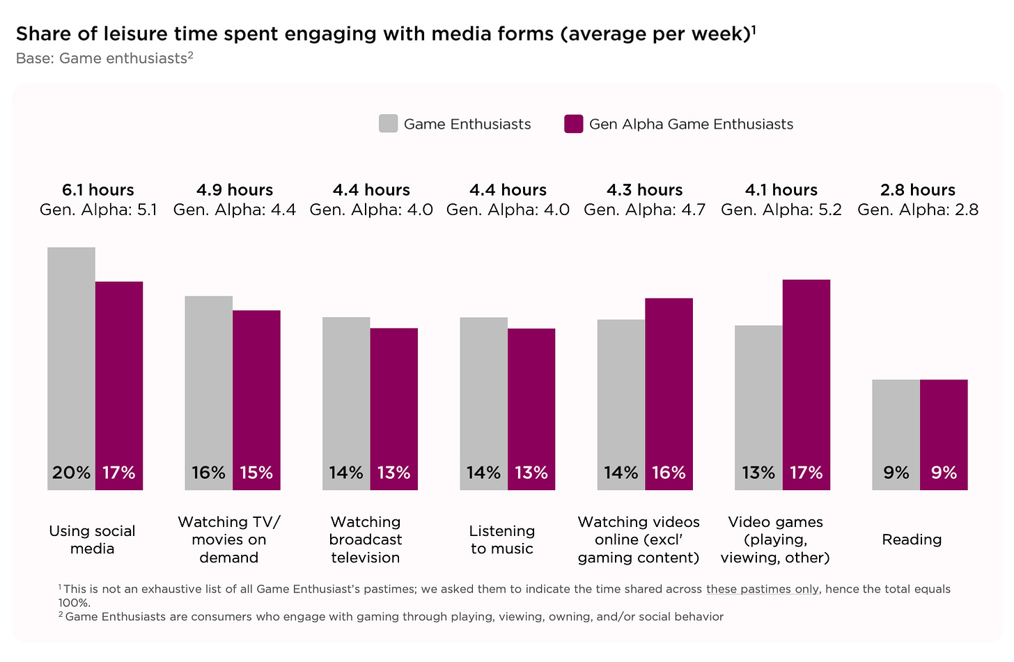Generation Alpha is the first to spend more time on games (5.2 hours per week) than on social media (5.1 hours per week).