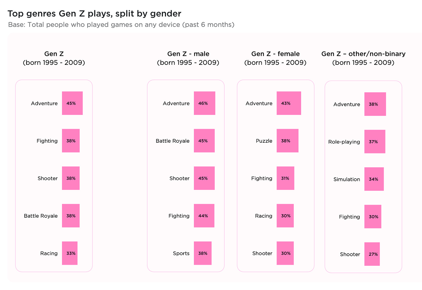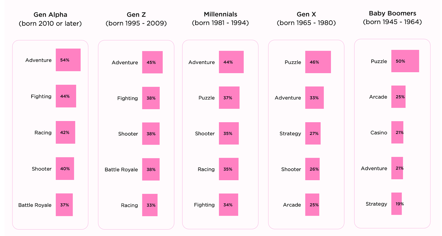 Adventure games are the most popular genre among Generation Alpha, Generation Z, and millennials. Older people prefer puzzle games.