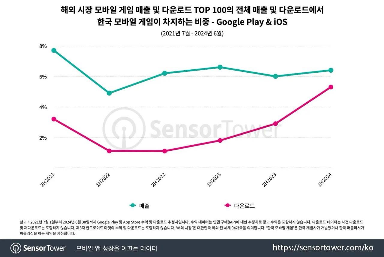 In terms of downloads, games by Korean developers have shown growth since the second half of 2022. They grew from a 1% share in the top 100 downloads in the second half of 2022 to 5.5% in the first half of 2024.