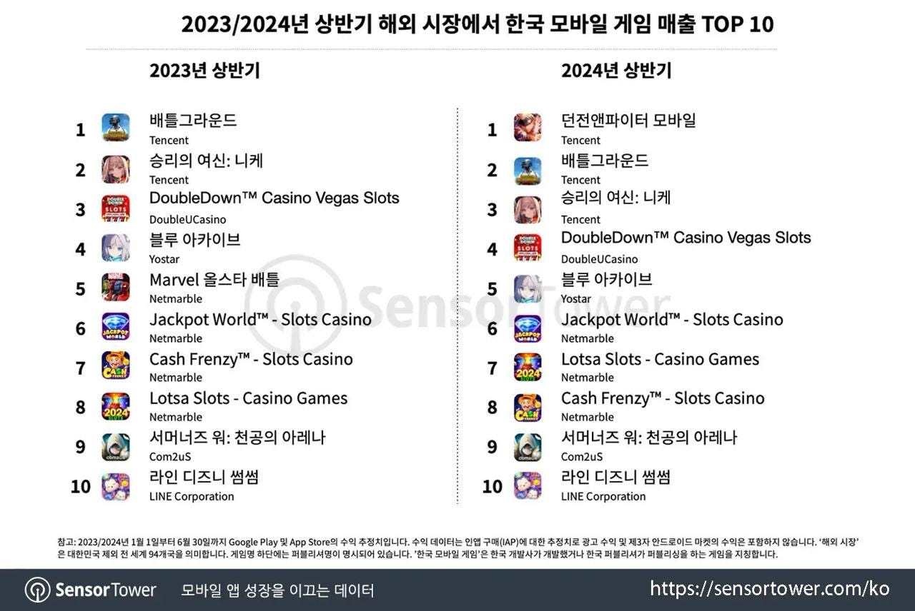 The South Korean leaders in revenue in the first half of 2024 are Dungeon Fighter Mobile, PUBG, and Goddess of Victory: Nikke. The list includes 4 casino games - 1 from DoubleUCasino and 3 from Netmarble.