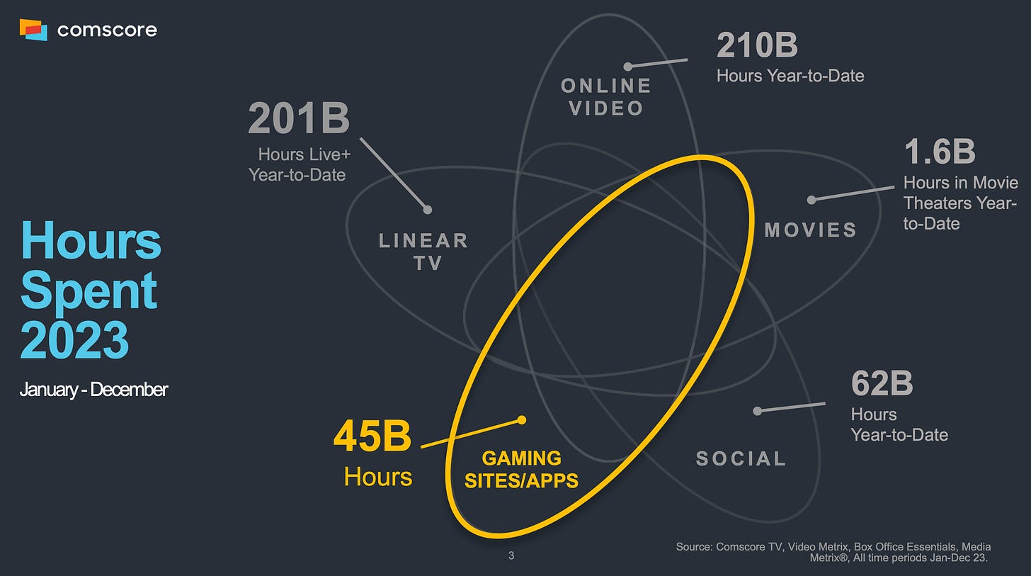 - In 2023, American users spent 45 billion hours on games and related activities. This is less than the time spent watching online videos (210 billion hours); television (201 billion hours); and time on social media (62 billion hours).
