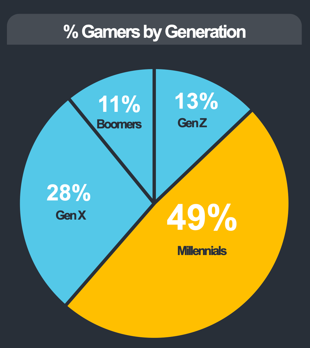 49% of American gamers are millennials. This is the largest group. 28% are Generation X; 13% are Generation Z; 11% are boomers.