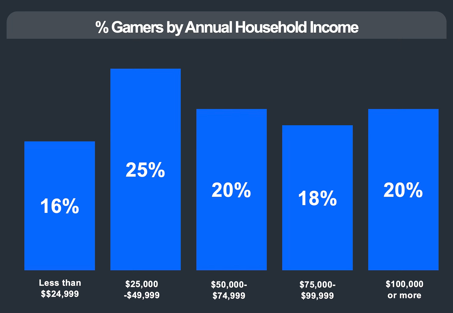 63% of gaming households earn between $25,000 and $100,000 a year. 16% earn less than $25,000; 20% earn more than $100,000.