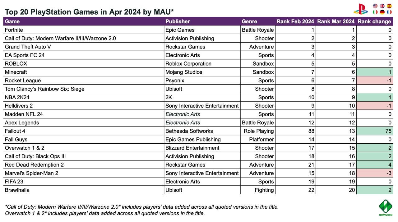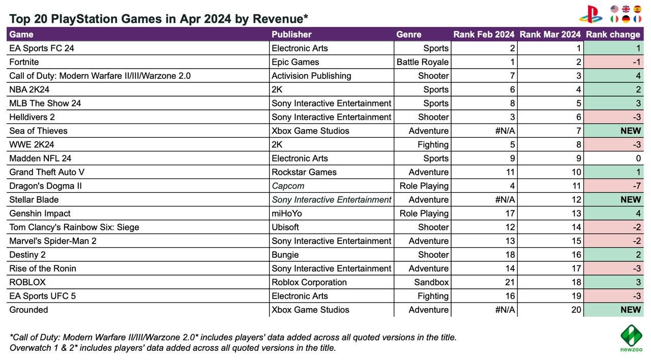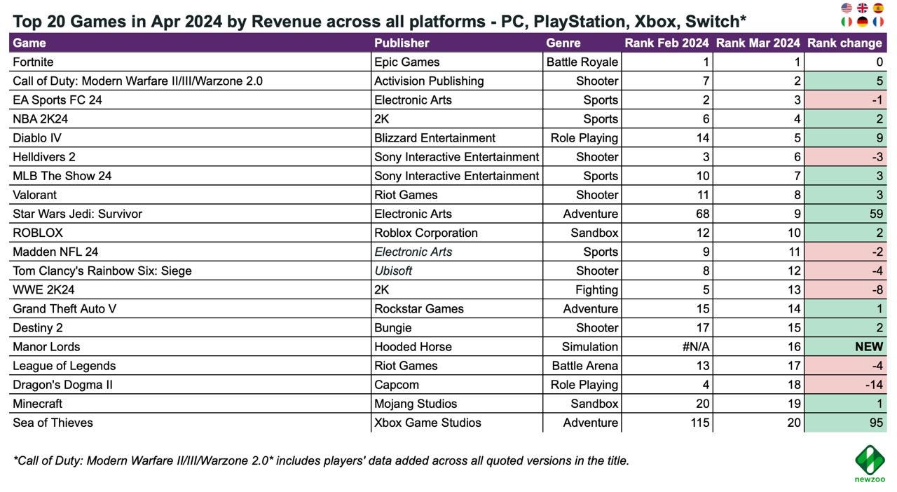 - Newzoo: Top 20 PC/Console Games of April 2024 by Revenue and MAU