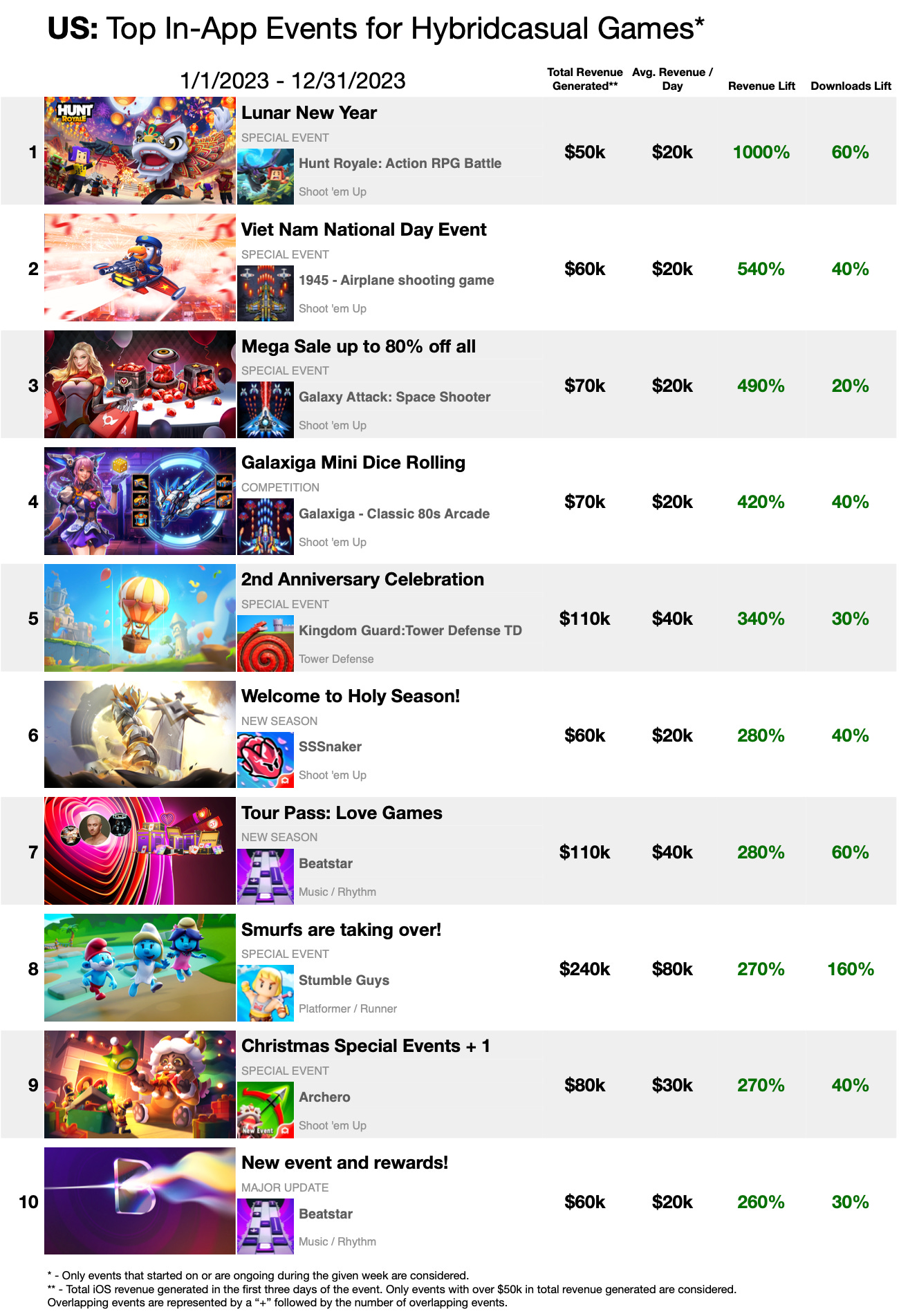 - Out of 10 events, only one project has an IP collaboration - Stumble Guys. The event with the Smurfs increased revenue by 270%, and downloads by 160%.