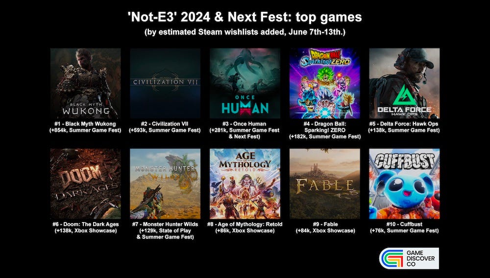 - According to GameDiscoverCo, Black Myth: Wukong has over 4 million wishlists on Steam, with 60-70% of them coming from China. During the 2024 Summer Game Fest, the game has been added to wishlists 854,000 times.