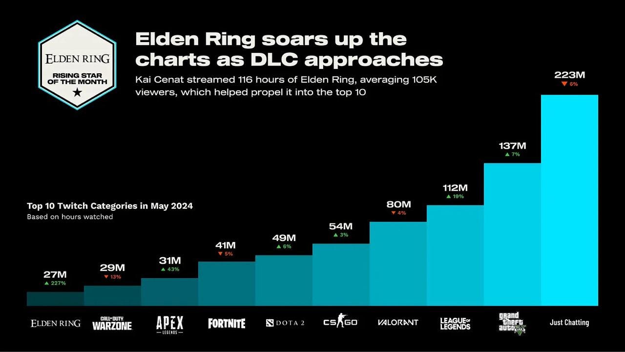 StreamHatchet: The Release of Elden Ring: Shadow of the Erdtree significantly increased Elden Ring’s popularity on Streaming Platforms