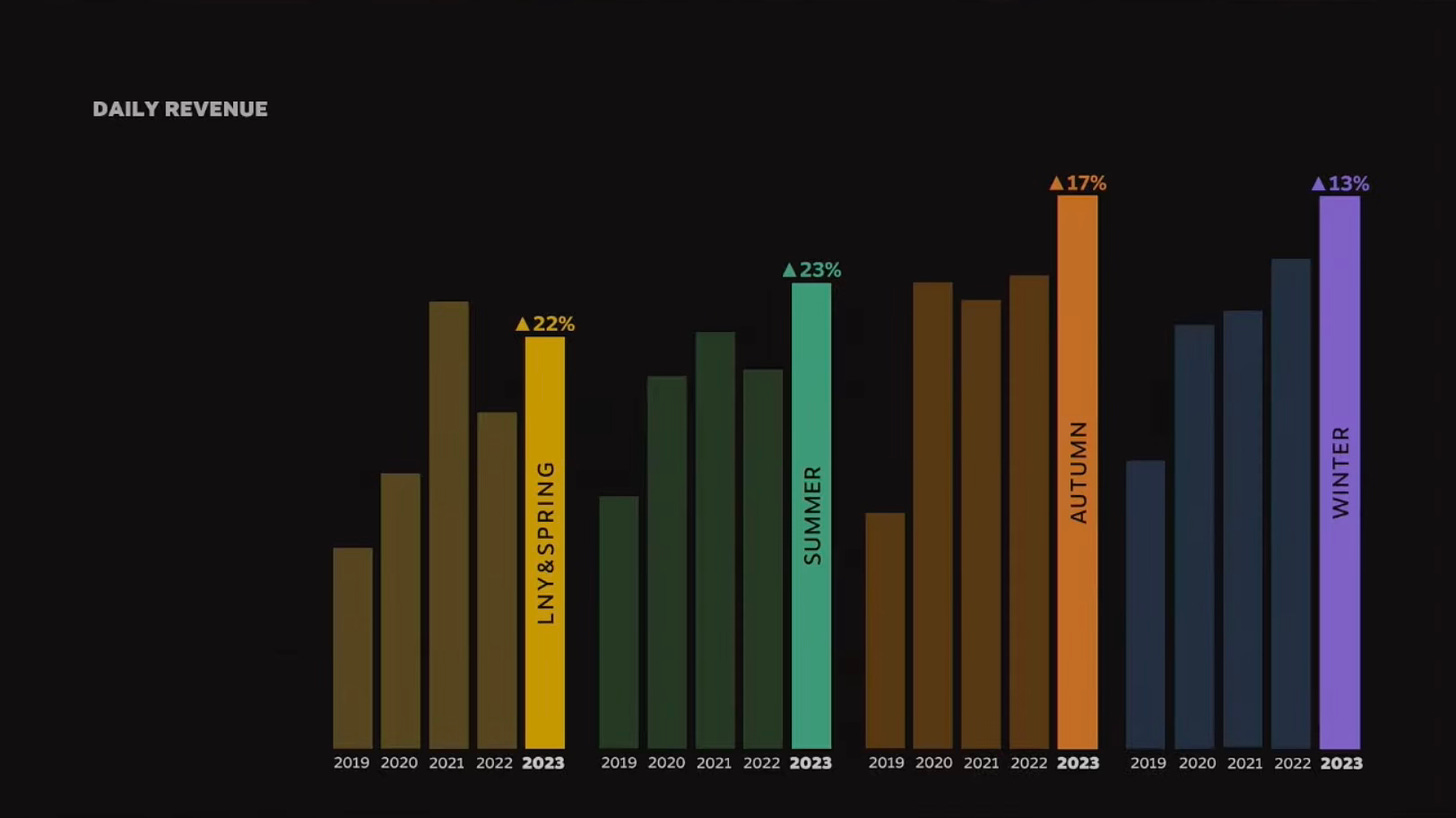 - Daily revenue from seasonal sales on Steam is growing. The Spring Sale in 2023 increased by 22% year-over-year (YoY); the Summer Sale by 23%; the Autumn Sale by 17%; and the Winter Sale by 13%. All sales, except for the Spring Sale, set absolute revenue records in 2023.