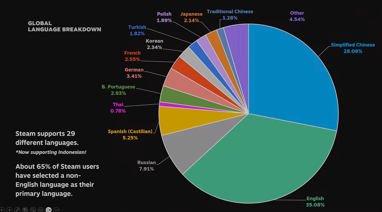 65% of Steam's audience indicated a primary language other than English. This underscores the importance of localization.