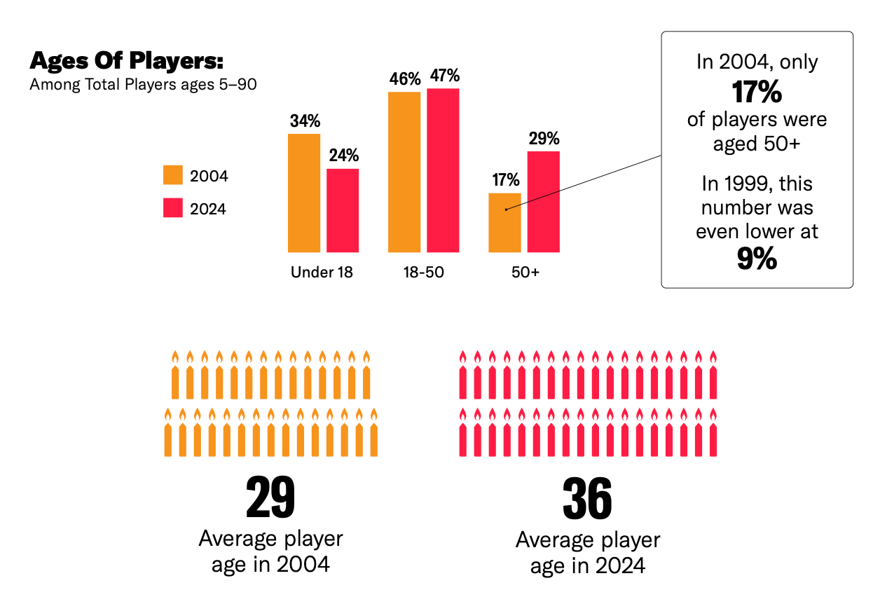 The average age of a gamer today is 36 years. Twenty years ago, the average age was 29 years. The percentage of gamers over 50 years old is 29% - in 2004, it was only 17%. Meanwhile, the rate of gamers under 18 years old decreased from 34% in 2004 to 24% in 2024.